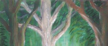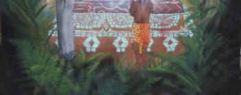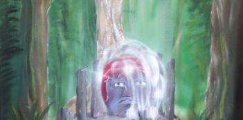 In September of 2000 I visited several sacred sites in Mexico. One of the most wonderful experiences I had was seeing and feeling the Olmec stones in the archeological park at Villa Hermosa. While there one of the giant Olmec stone carvings struck me in a powerful way. The energy radiating from it was palpable. When I closed my eyes to immerse myself in the feeling the image of the shaman transmigrating his spirit into the stone flooded my being and I knew I had to paint the scene.
