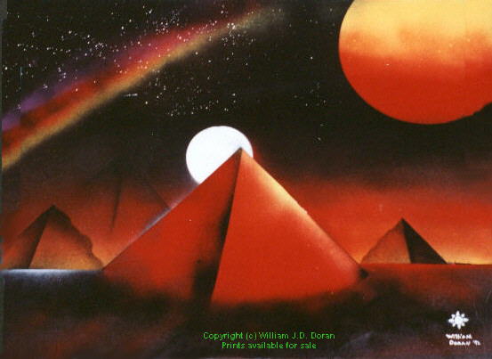 The moon rises as the sun sets over a land marked with pyramids fading into past glory.